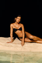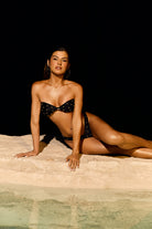 Modelo: Top Tomara que Caia com aplicação de tachas douradas. Possui bojo removível.