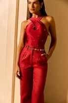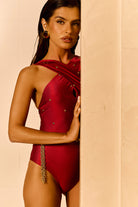Modelo: Maiô frente cruzada com aplicação de tachas douradas.