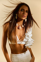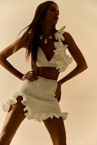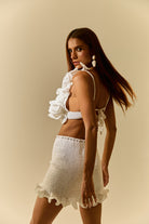 Modelo: Conjunto de Top e Mini saia em crochê artesanal, confeccionados à mão, com babados aplicados nas peças.