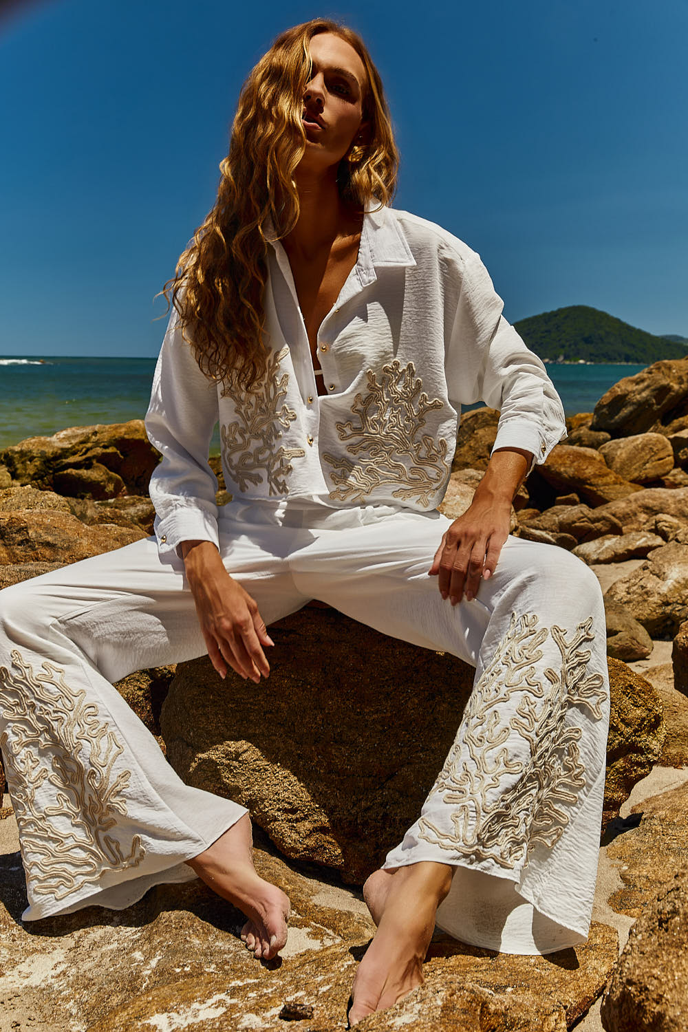 • Bordado de cordão em formato de coral nas laterais das barras.