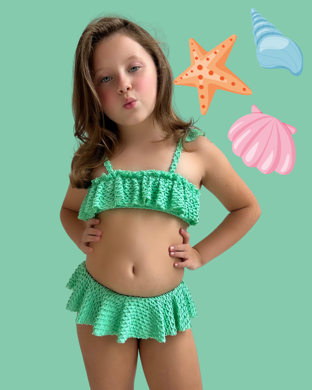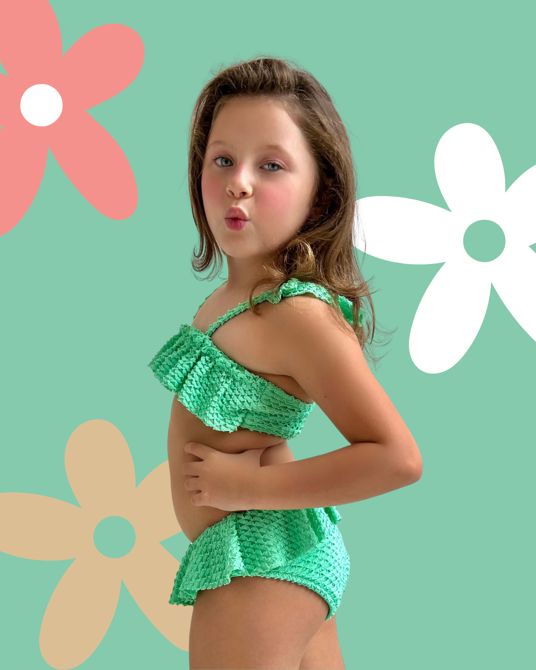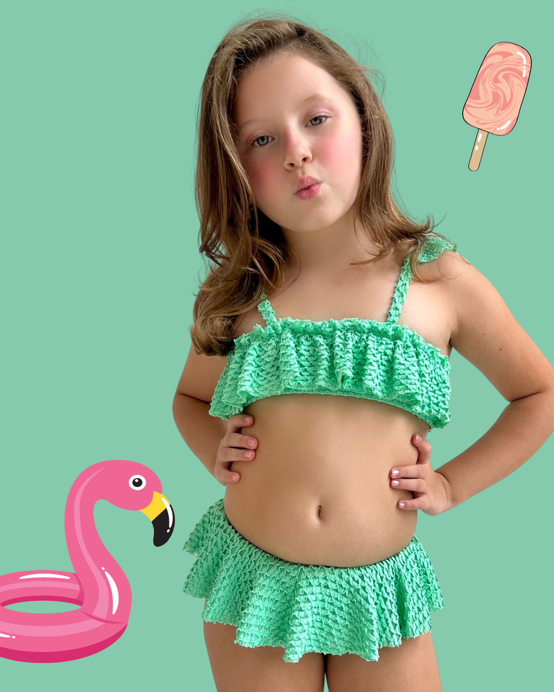 Modelo: Conjunto de Biquíni infantil, com detalhe de babados no top e na calcinha, em tecido com textura de escama.