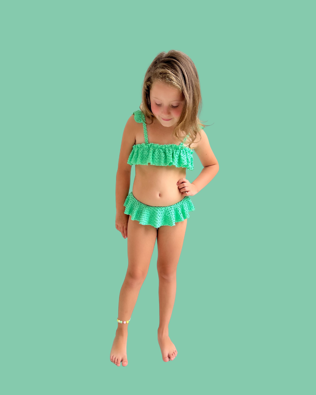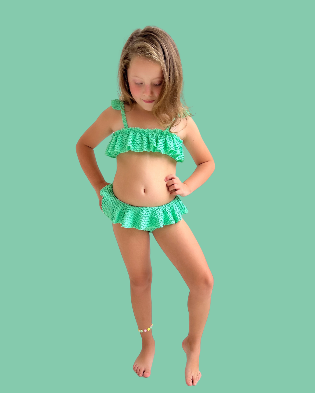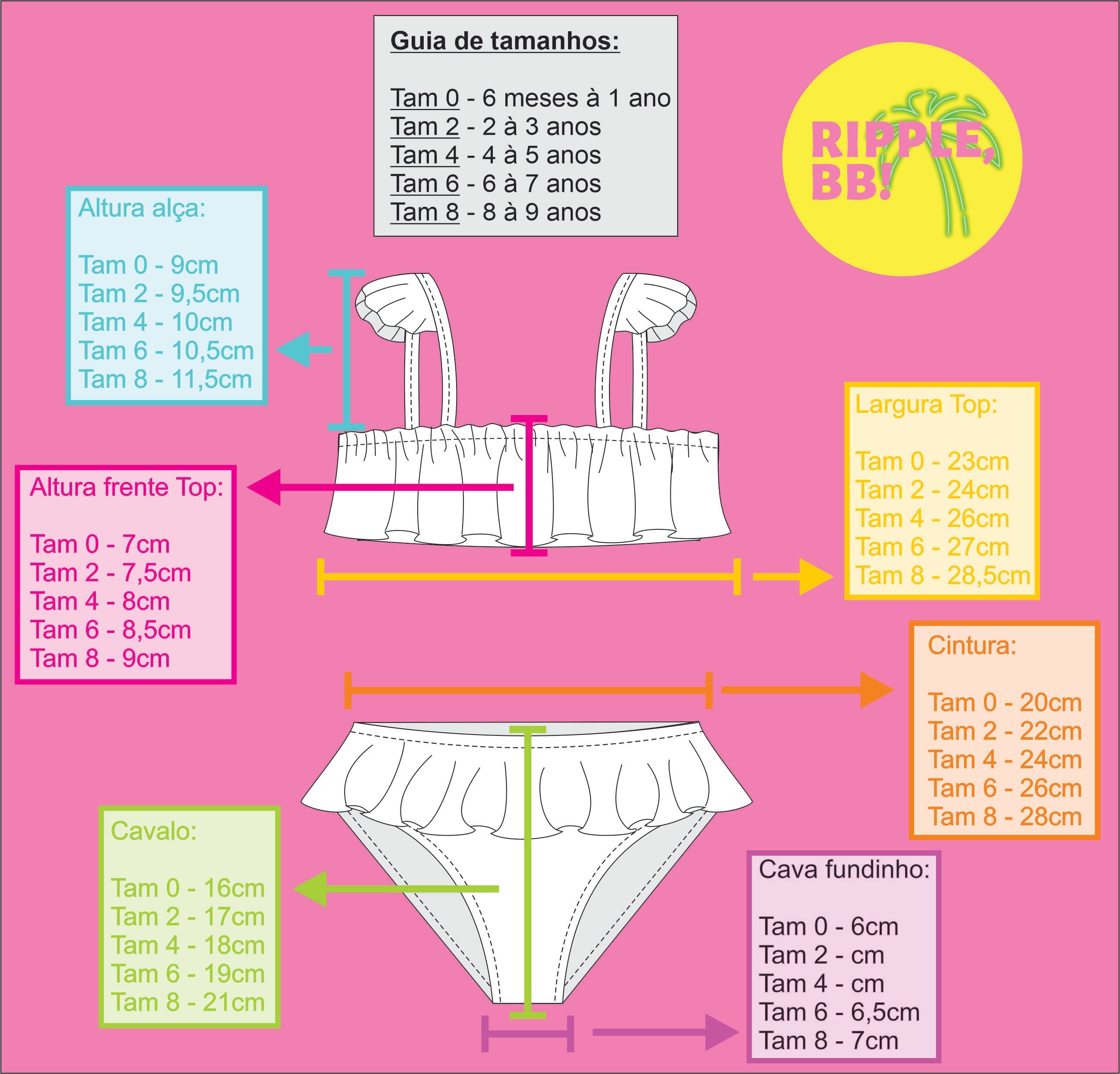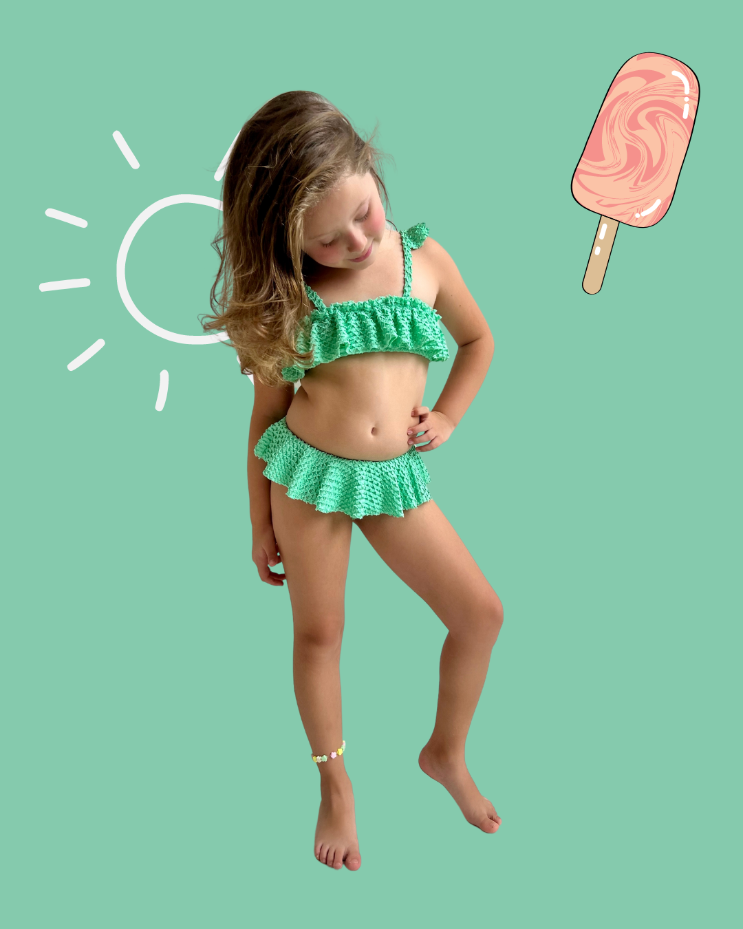 Modelo: Conjunto de Biquíni infantil, com detalhe de babados no top e na calcinha, em tecido com textura de escama.
