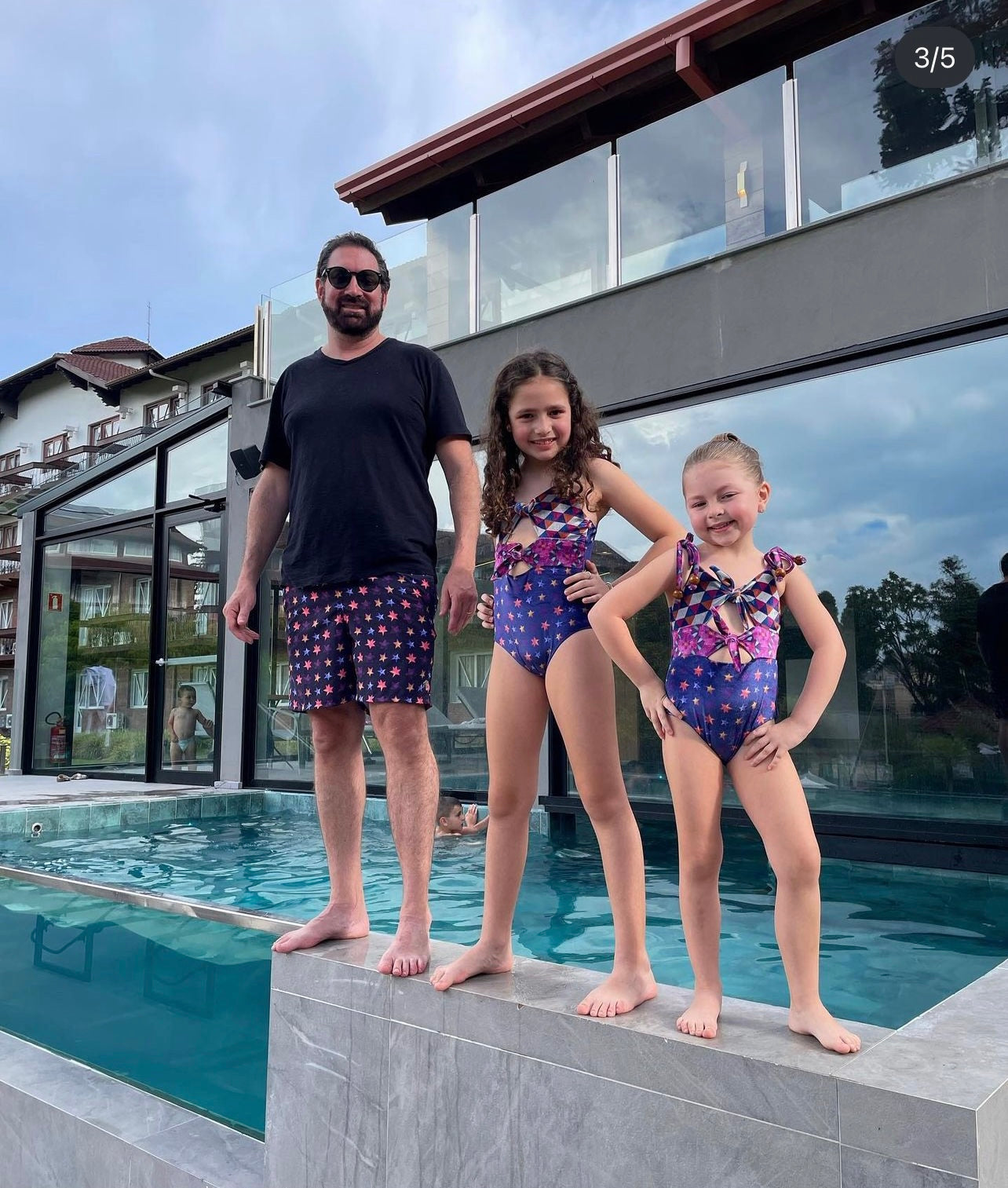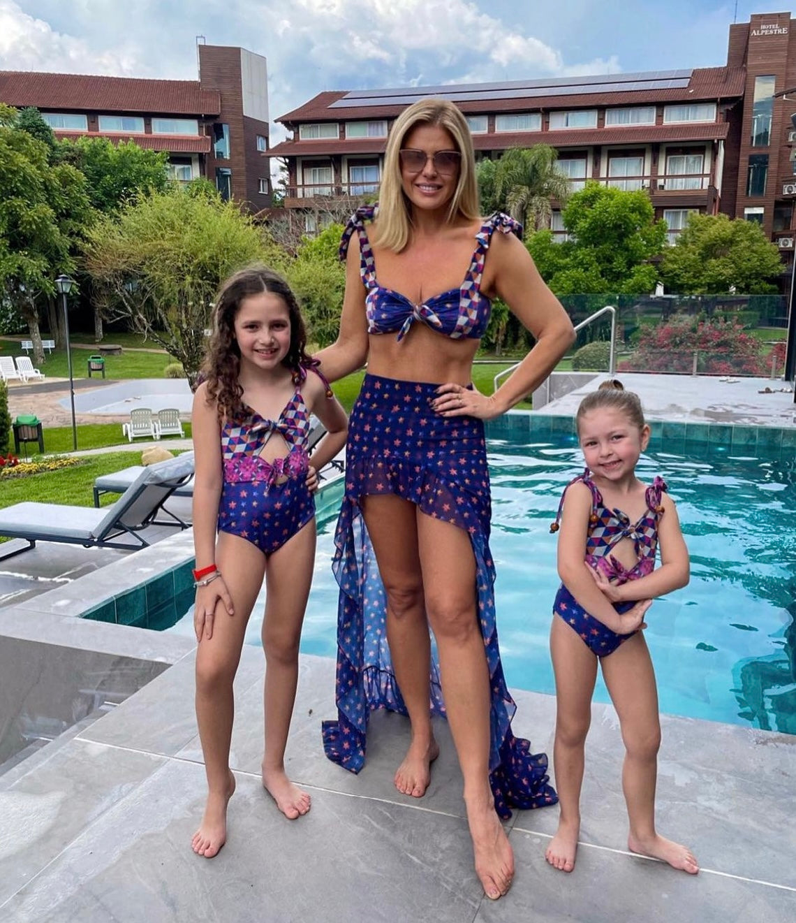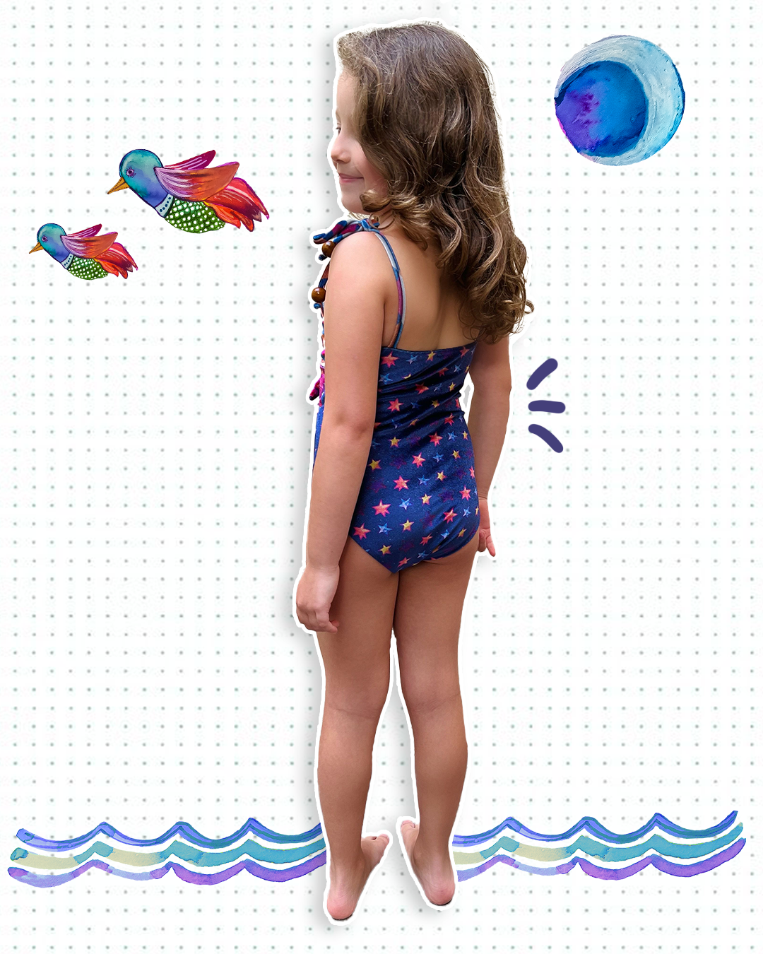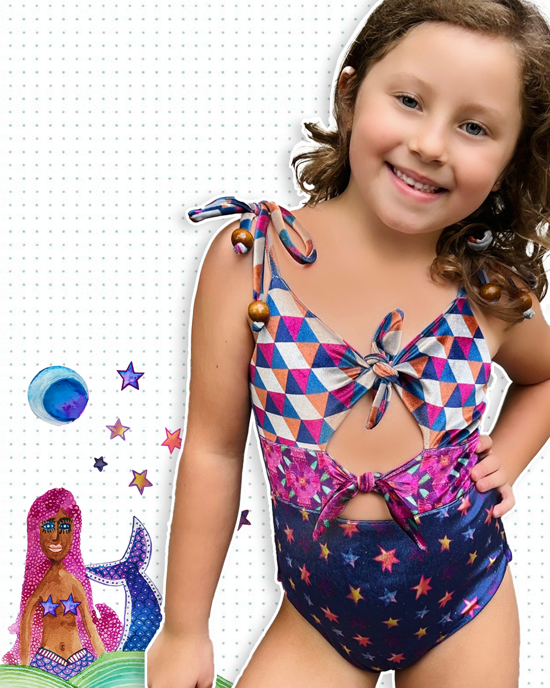 Modelo: Maiô infantil com duas amarrações frontais e amarração nas alças com detalhe de esferas de madeira.