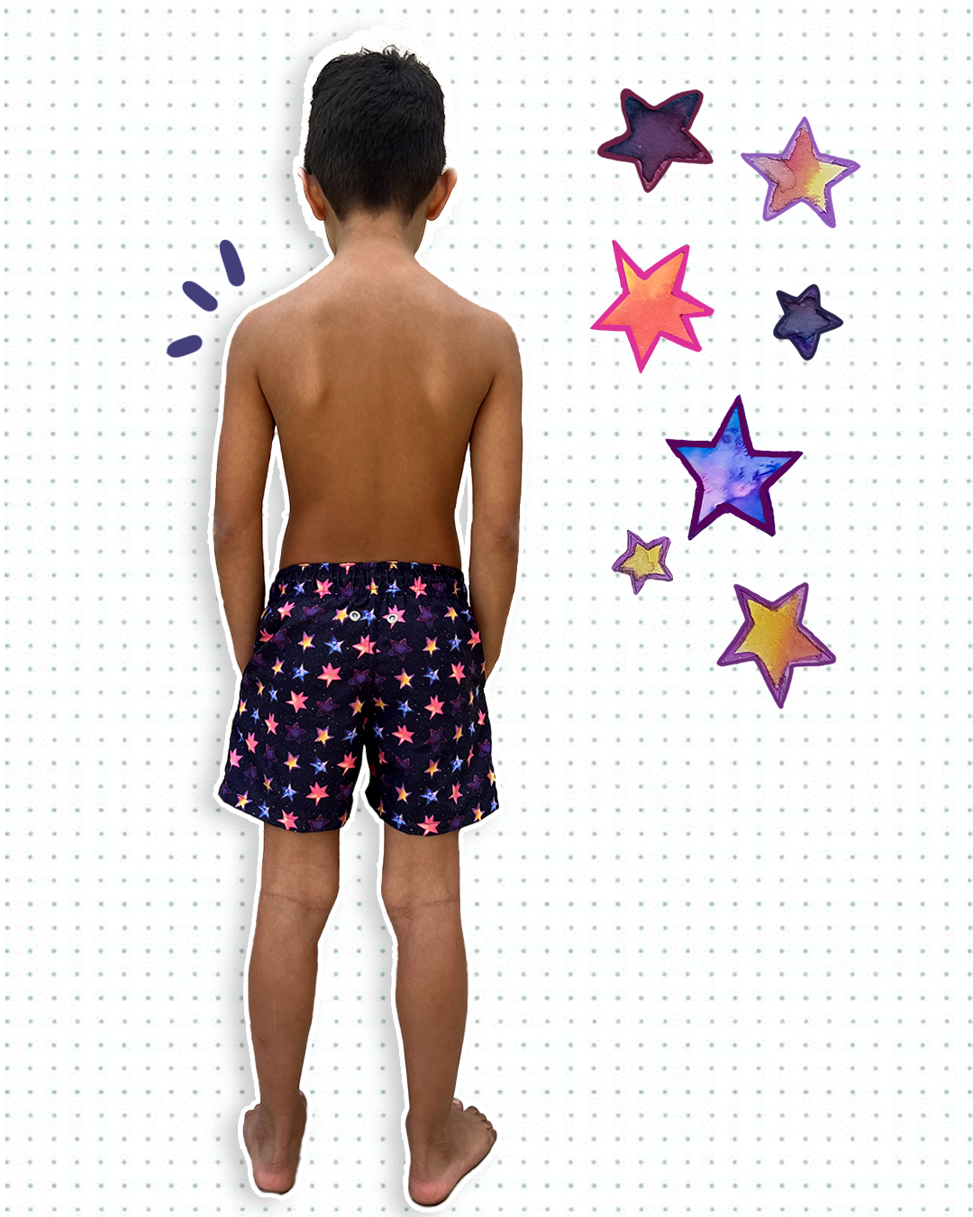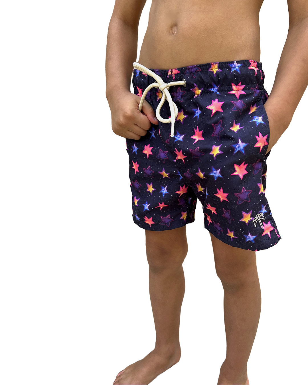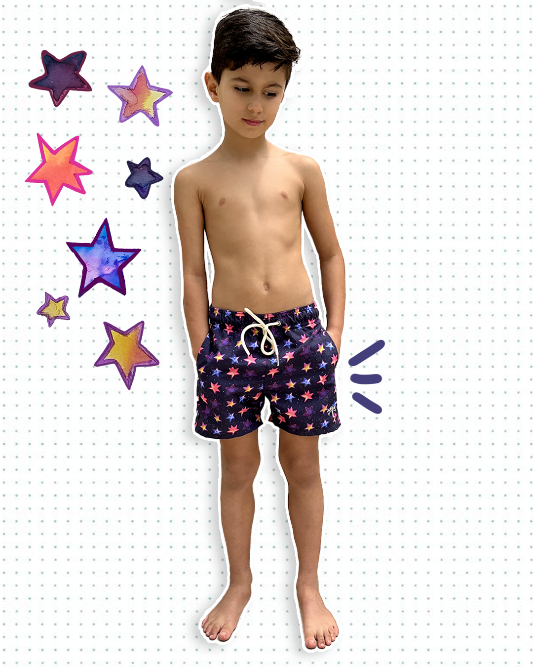 Modelo: Shorts masculino infantil com estampa exclusiva, com bolsos laterais e traseiro, cordão pra regulagem de cintura com ponteira de metal, cueca interna em poliamida.
