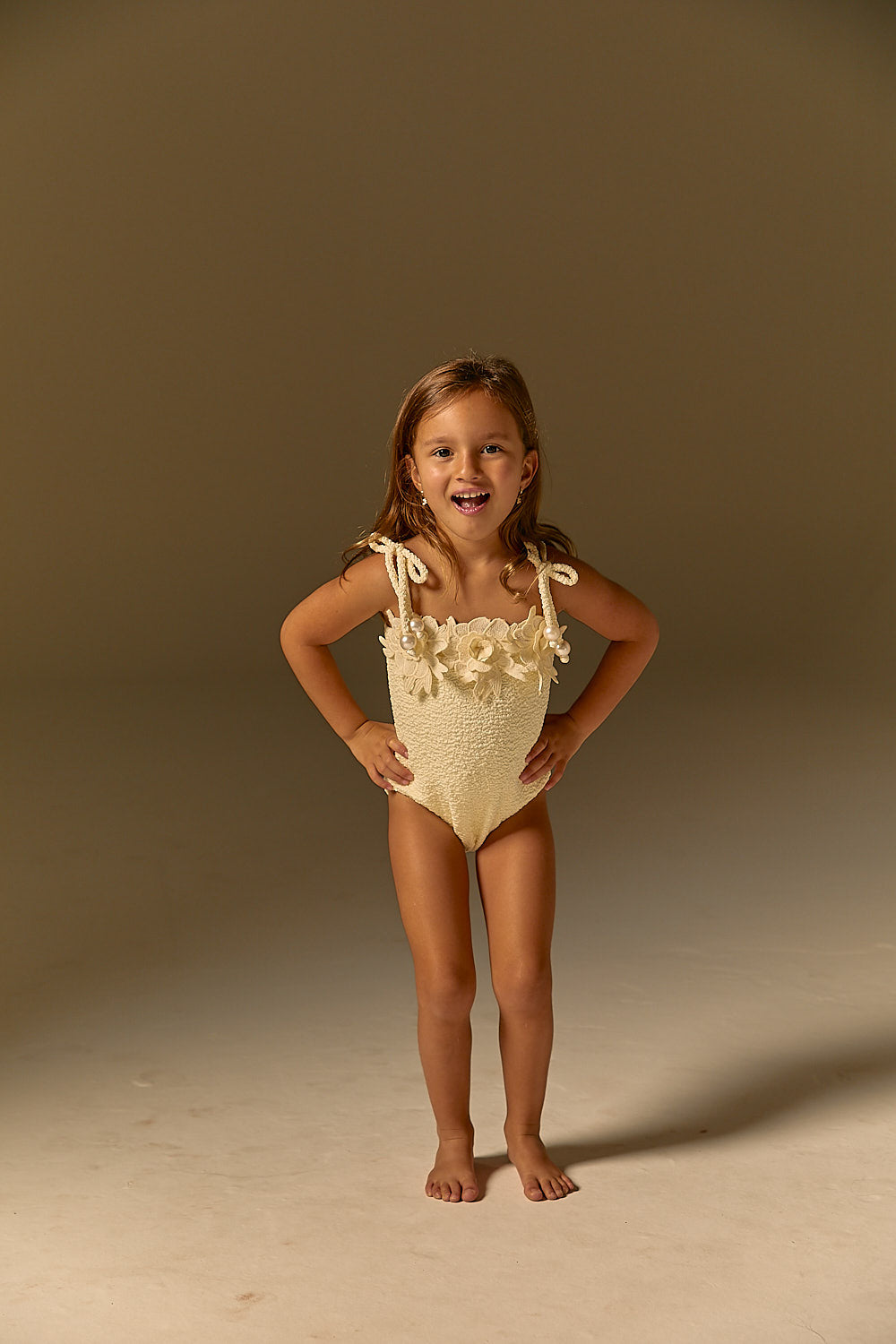 Modelo: Maiô Tomara que Caia infantil com aplicação de flor em Guipir. Alças fixas com ponteiras em pérolas com amarração nos ombros.