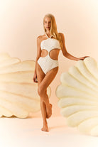 Modelo: Maiô Off-White, feito em tecido de Matelassê com estampa em relevo de conchas. Possui aplicação de pérolas na alça de amarração no pescoço. Fecho de metal nas costas. Não possui bojo.