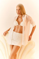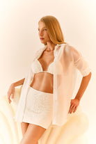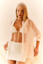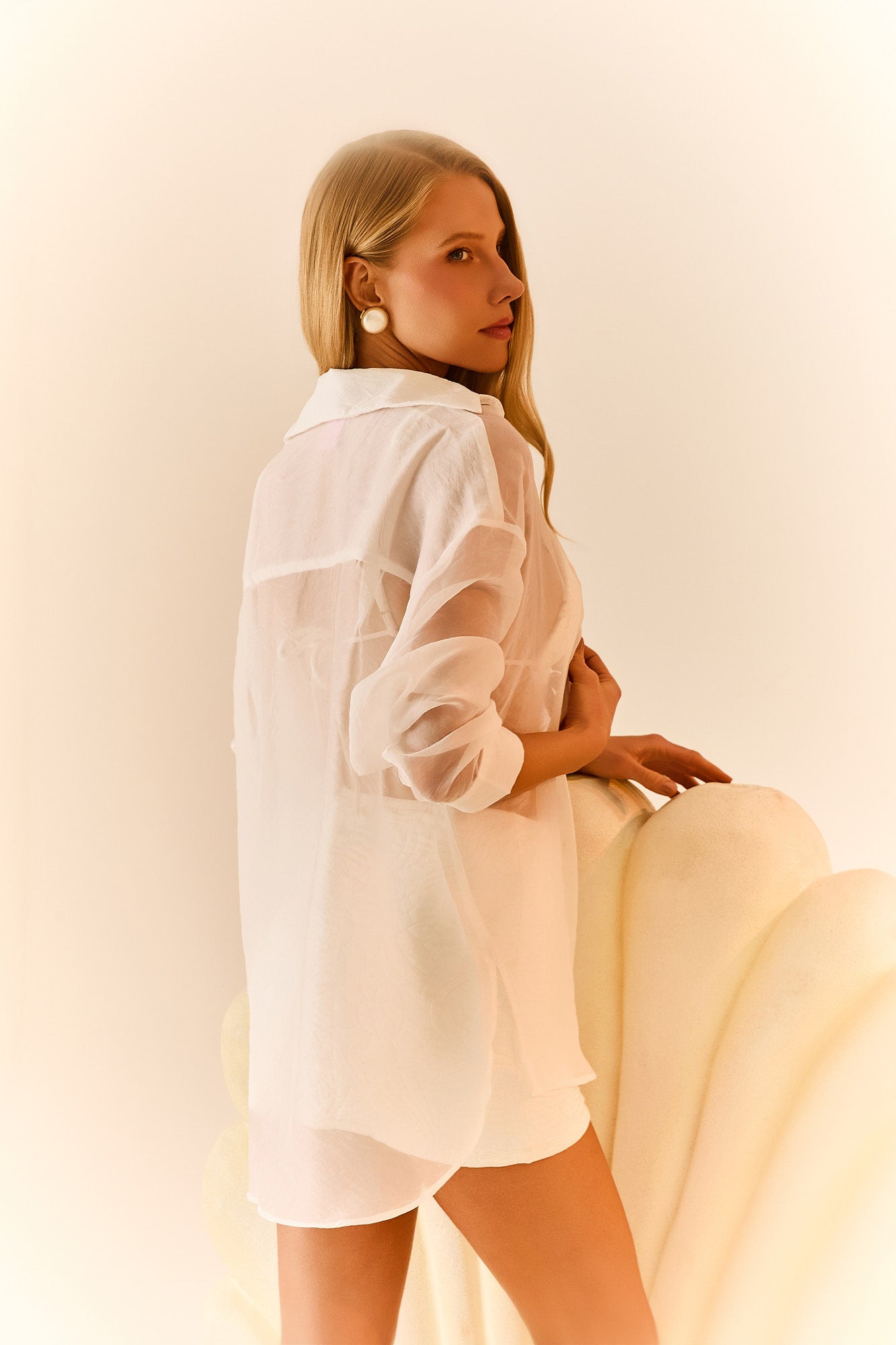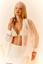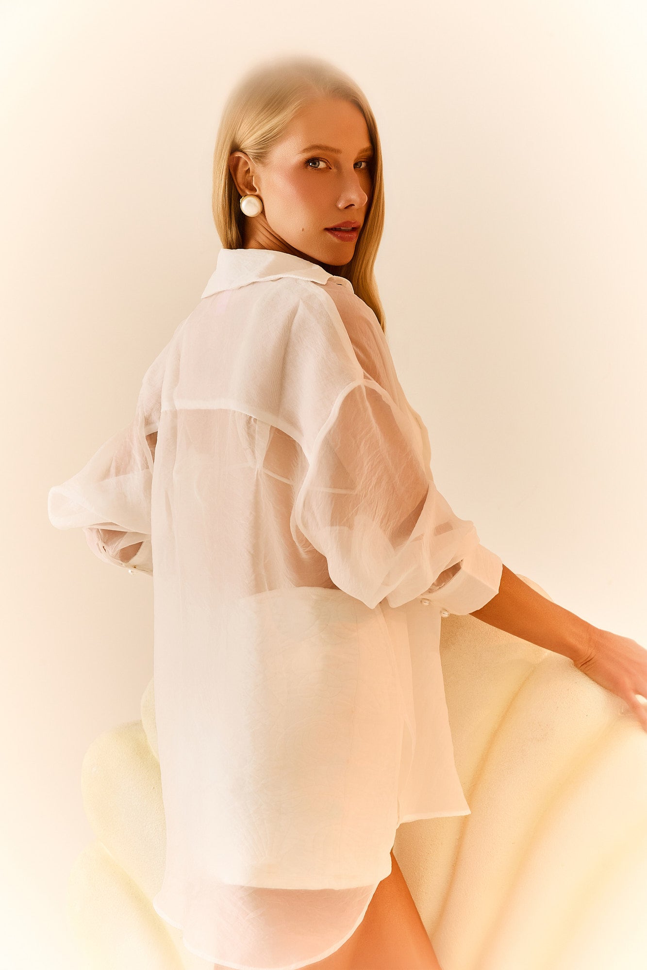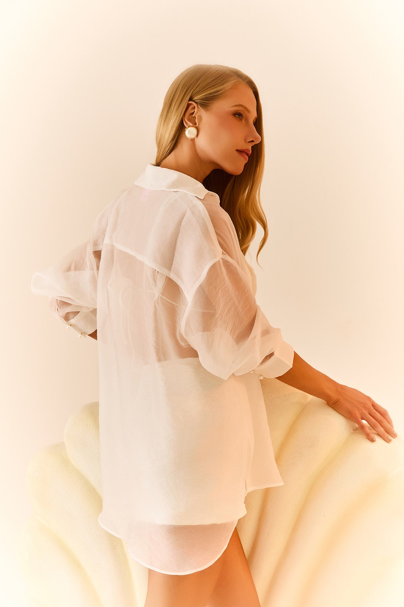 Modelo: Camisa Off-White, feita em tecido de Voal transparente, com fechamento por botões de pérolas.