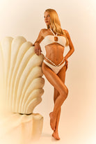 O drop explora formas orgânicas e detalhes em alto relevo, trazendo a inspiração das conchas e do mar de forma sofisticada e contemporânea. Os aviamentos em pérola enriquecem as peças, elevando o acabamento e a identidade da coleção.
