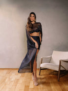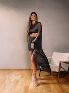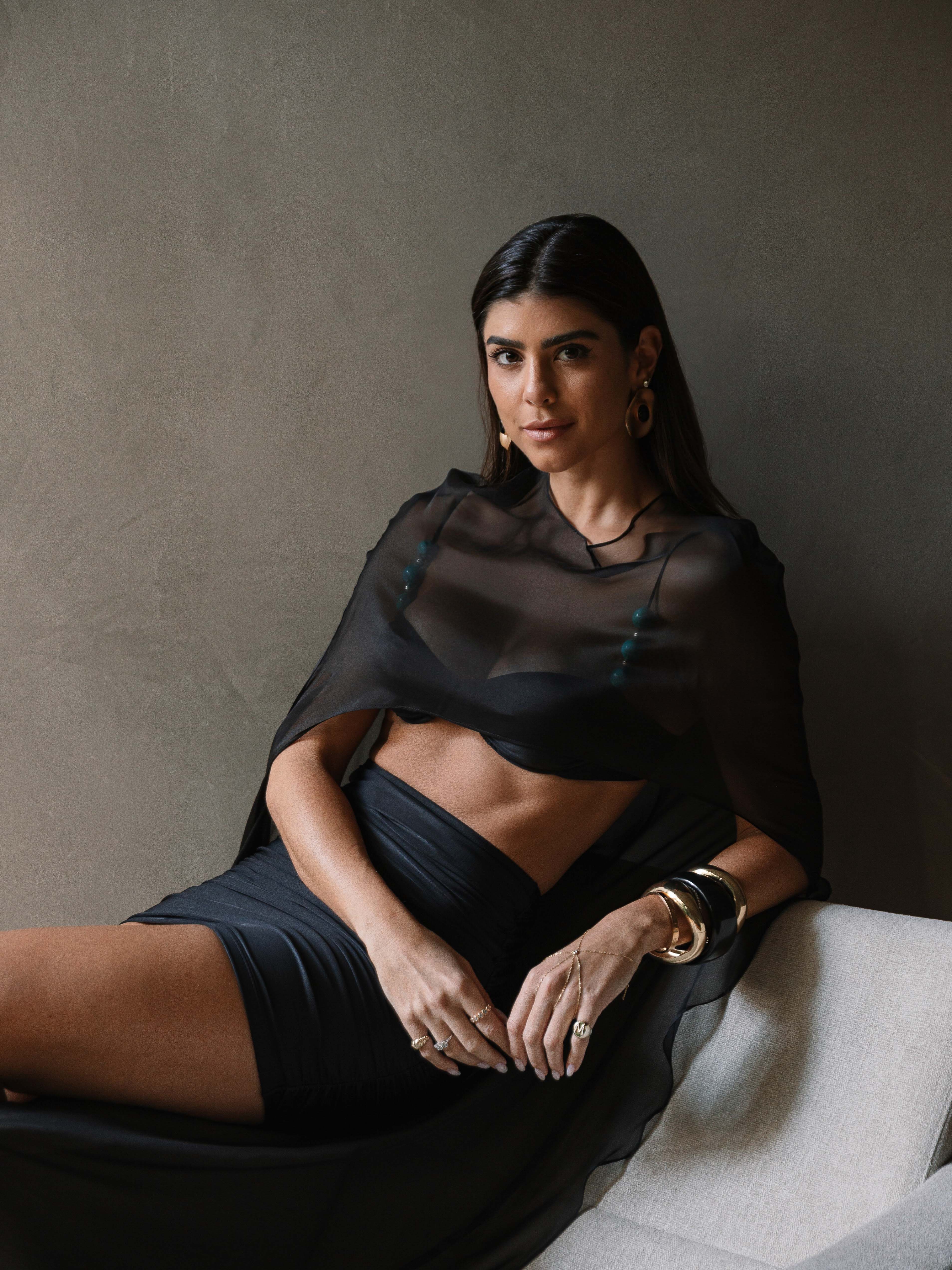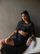 Descrição: Blusa curta na frente em Seda pura com transparência e modelagem ampla. Comprimento das costas mais longas que a frente.